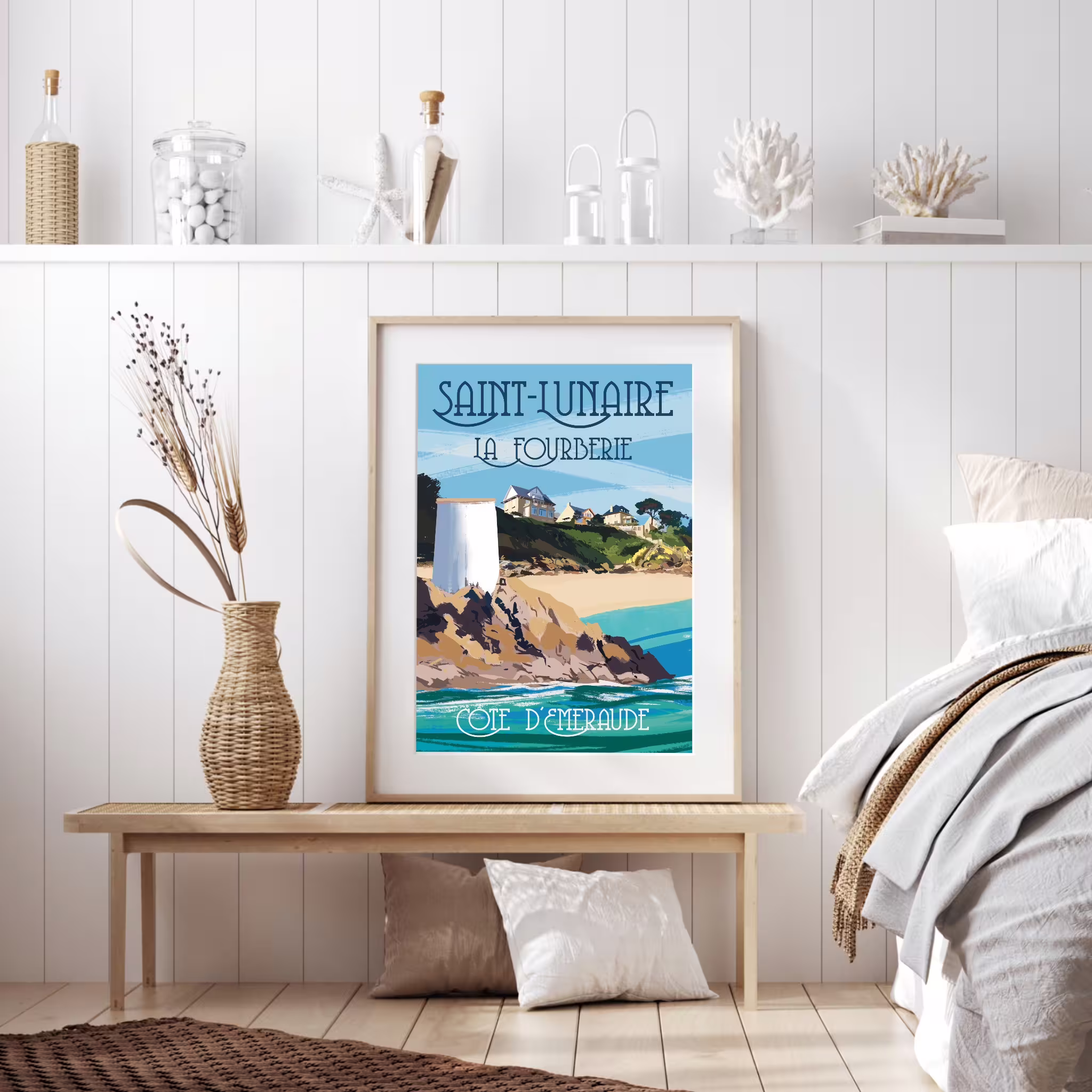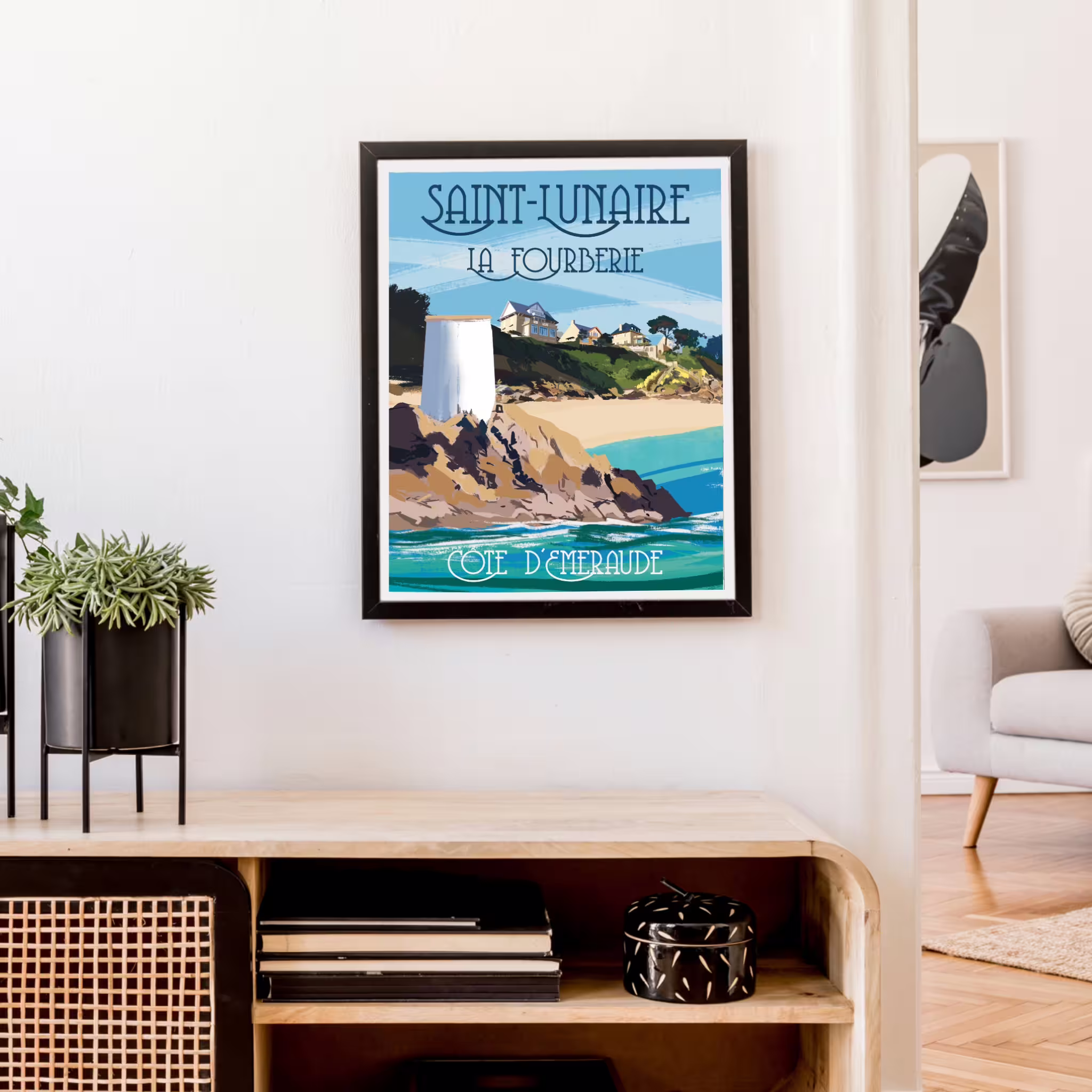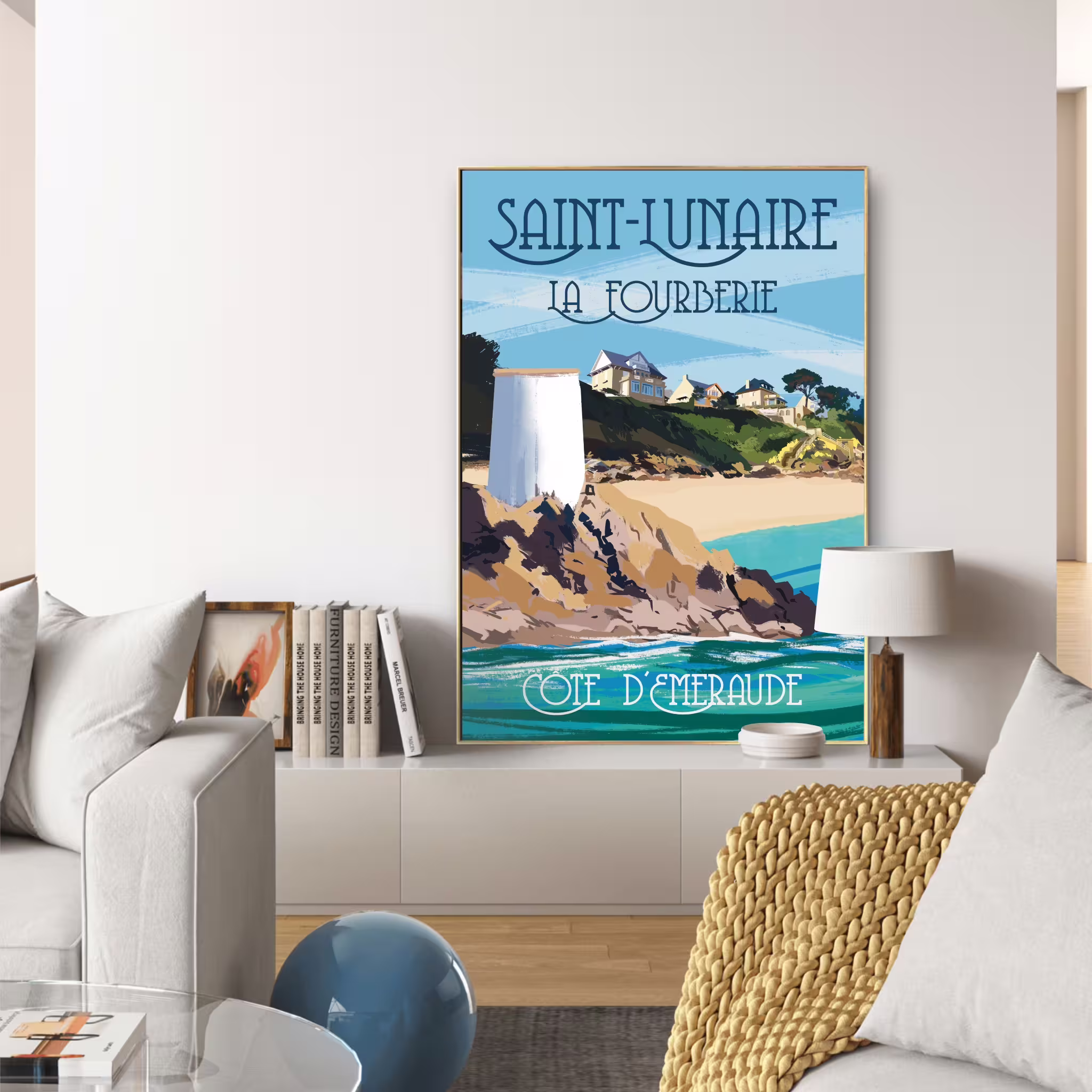 Cette affiche est un bel objet de décoration murale pour plusieurs raisons. Premièrement, elle évoque un lieu emblématique avec une forte charge émotionnelle et historique, parfait pour ceux qui ont des liens personnels avec Saint-Lunaire ou qui apprécient les paysages côtiers français. Deuxièmement, son style vintage et artisanal ajoute une touche d’élégance et de charme à n’importe quel intérieur, qu’il soit moderne ou classique. Enfin, sa qualité artistique en fait non seulement un élément décoratif, mais aussi une véritable pièce de collection, capable de susciter l’admiration et l’intérêt des visiteurs.
