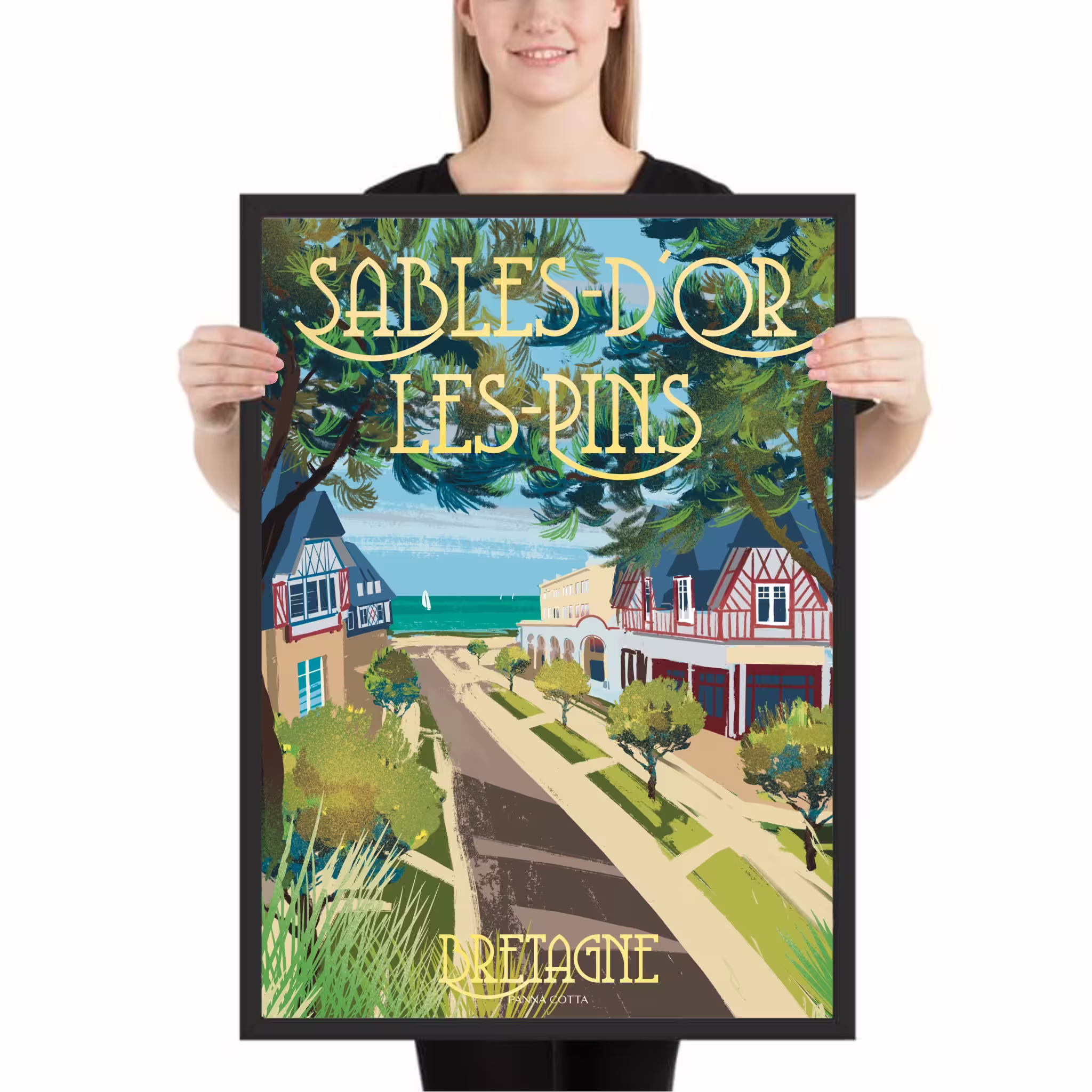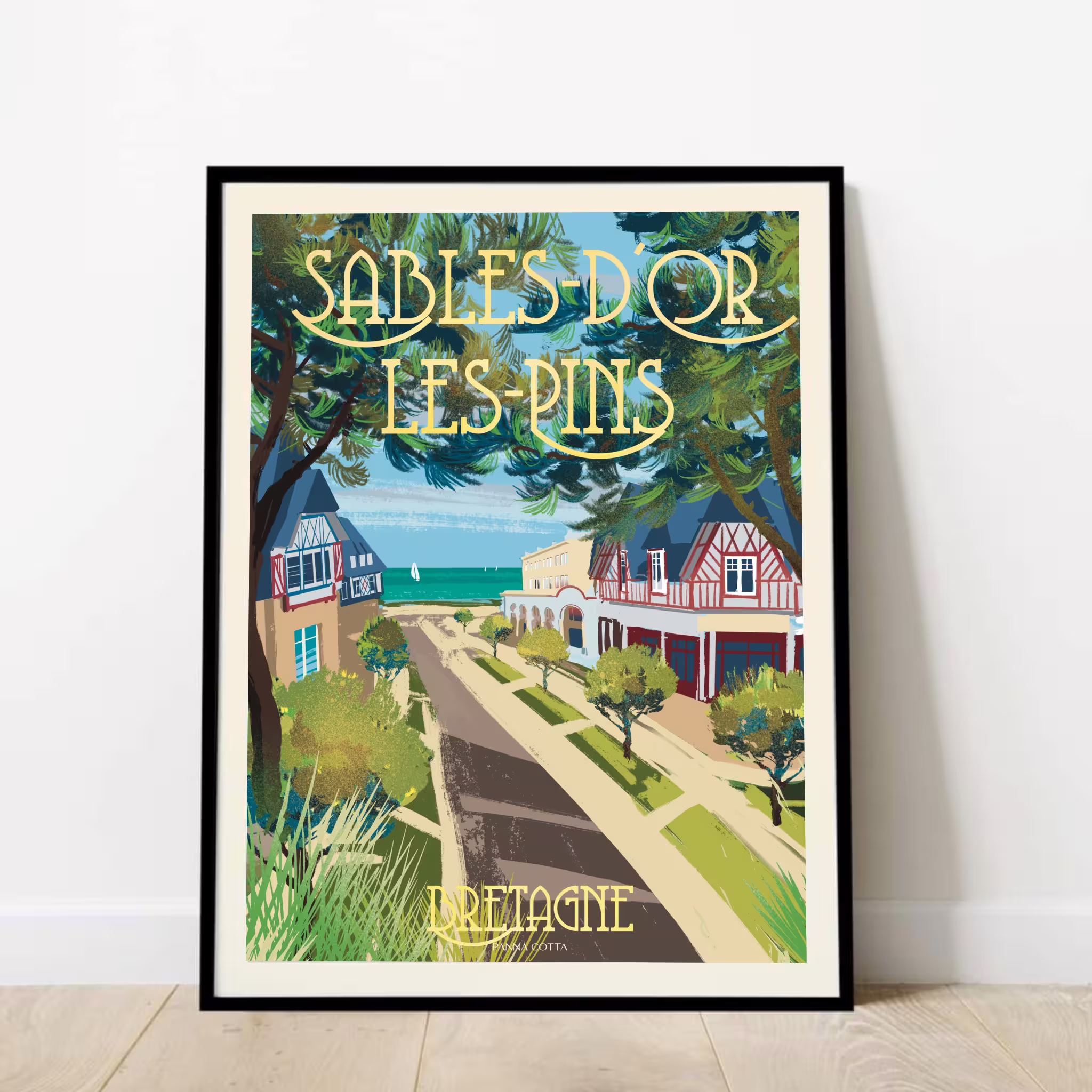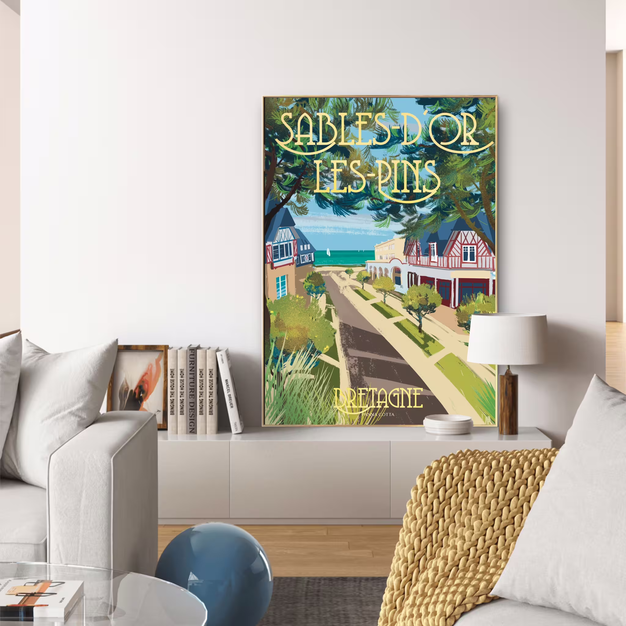En résumé, l’affiche vintage du village des Sables-d’Or-les-Pins est bien plus qu’une simple décoration. C’est un hommage visuel à un lieu emblématique, une pièce de collection qui évoque des souvenirs et inspire des rêves. Elle illustre à merveille la beauté intemporelle de cette station balnéaire, faisant de chaque regard posé sur elle un voyage instantané vers les rivages enchanteurs de la Bretagne.
